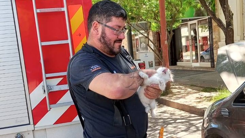 Según se informó, alrededor de las 11:15 horas una vecina se presentó en la guardia del cuartel alertando que un gatito había quedado atrapado en la puerta de un automóvil, en la intersección de calles Irigoyen y Sarmiento.
