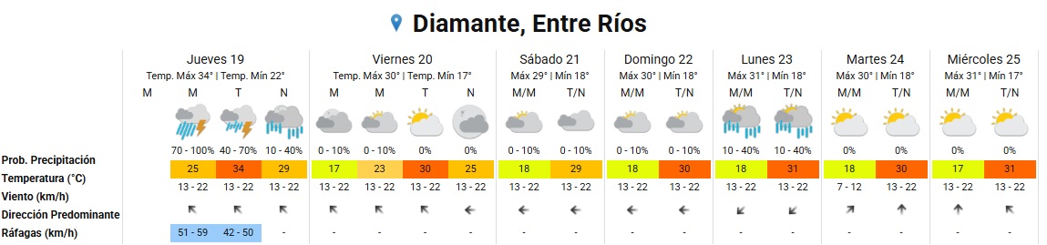 Desde el área de Defensa Civil de la provincia informaron que el Servicio Meteorológico Nacional emitió un alerta naranja por tormentas fuertes para los departamentos La Paz, Villaguay, Paraná, Diamante, Nogoyá, Victoria, Gualeguay, Concordia, San Salvador, Feliciano, Federal y Federación.